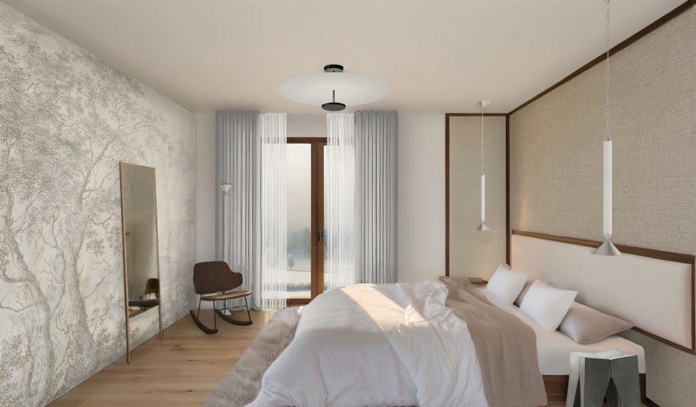Návrh ložnice v rodinném domě v Olomouci. Přáním klientů bylo navrhnout hlavní ložnici v domě tak, aby splňovala standardy moderní ložnice, ale navazovala na japonskou estetiku. Navrhly jsme výrazné čelo postele z ratanu přes celou zeď, připomínající japonské okrasné paravany. Celkový dojem jsme umocnily volbou přírodních materiálů, tapetou s japonskými motivy a ústředním osvětlením. Do návrhu interiéru jsme zároveň promítly moderní prvky betonových nočních stolků či závěsných svítidel, abychom propojily interiér ložnice s celkovou estetikou rodinného domu.